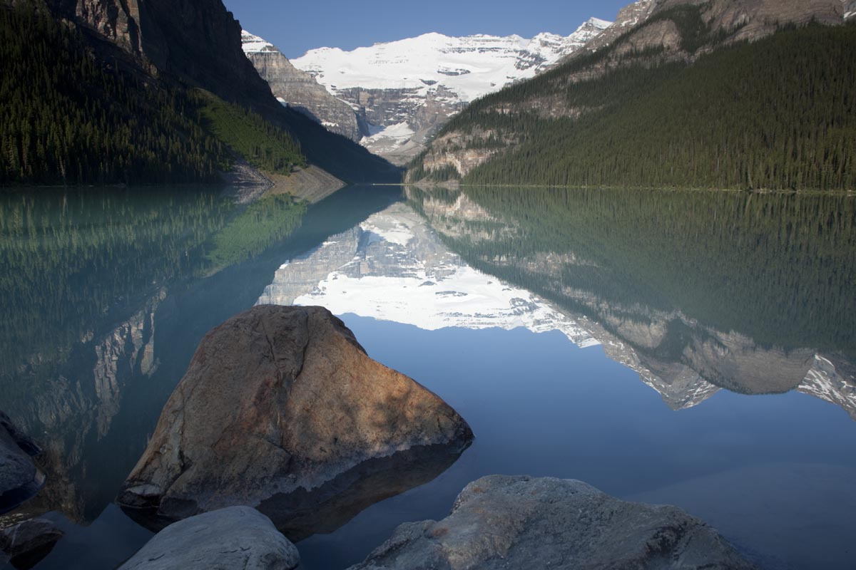 Even though it gets extremely busy, Lake Louise is a must-see destination in Banff National Park --especially during the early morning hours when there are only a few people walking around. Behind it, one can see a classic U-shaped valley, carved by a glacier whose remnants can be seen in Victoria Glacier on the skyline.